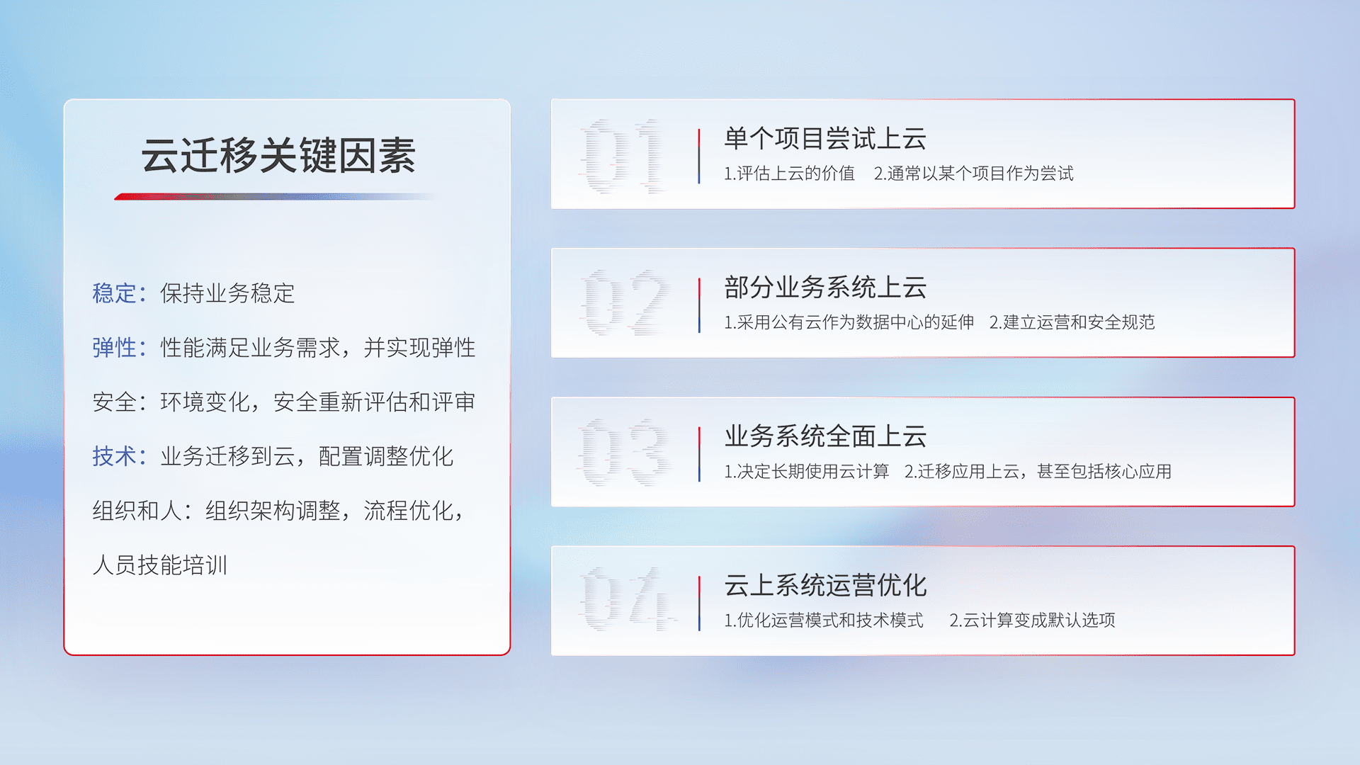 结合实际业务,,,,从规划设计、、云平台选型、、、、云原生改造、、、、数据迁移、、、、集成交付,,,迁移全过程为客户识别最佳上云路径,,,做好风险识别管理,,,设计网络架构、、、、身份权限、、、安全审计合规、、操作审计、、、日志审计、、、、监控告警策略、、、多站点容灾设计等,,,,对云上基础设施进行整体规划,,,,提升IT治理水平,,,,以满足弹性、、高可用、、、高性能的需求。。。。